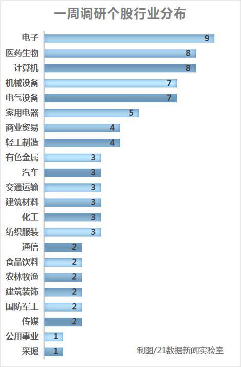 从行业看,电子行业最受关注,9家公司获机构调研,其次为医药生物和计算机,机构均分别调研了8家上市公司,这3个行业都是近几周的大热行业。
