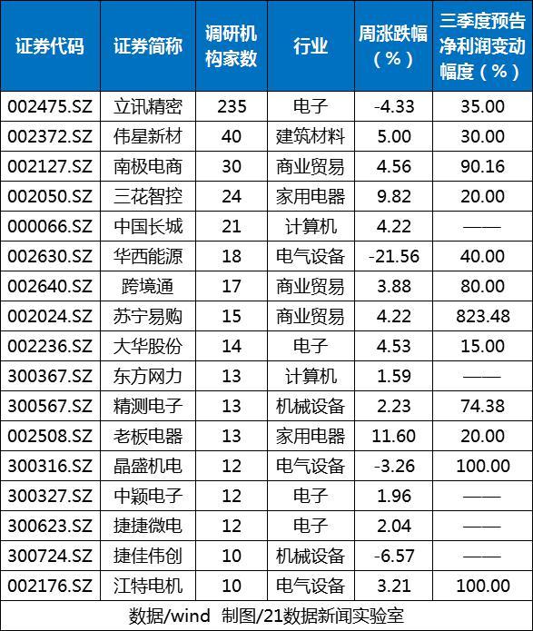 被10家以上机构调研的个股名单(附市场表现和三季报业绩预告)
