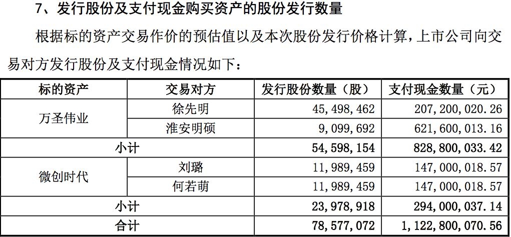 收购万圣伟业时,利欧股份采取了发行股份加支付现金的方式,支付给徐先明的现金为2.07亿元。