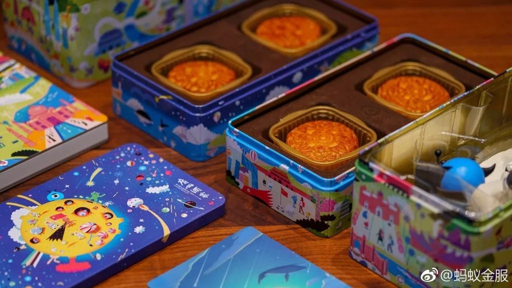蚂蚁金服的月饼走的是情怀路线。月饼盒,外表插画画的是蚂蚁金服打下的“江山”: