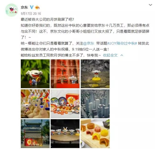 京东的这款月饼并非“员工特供”哦,早在9月17日,京东官方微博就举办了送出这款月饼的抽奖活动: