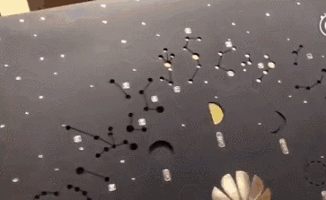 盒盖采用镂空设计,背后放黄色的纸张移动,内圈模拟8个月相,外圈为28星宿,就这小小的创意,瞬间觉得自己是宇宙里小小的一粒尘埃。
