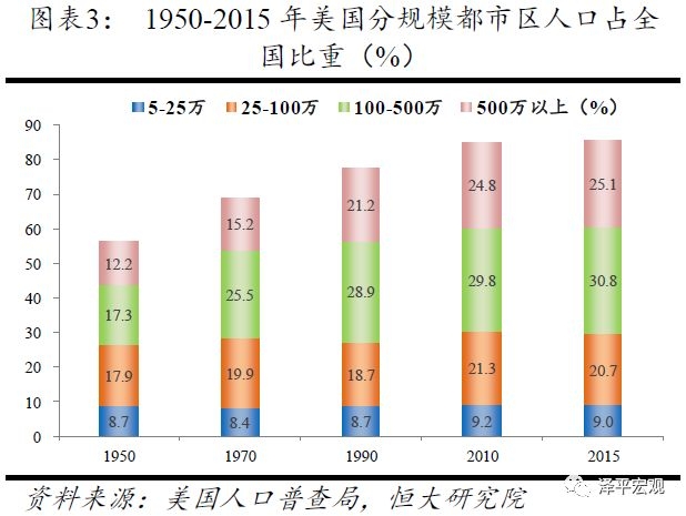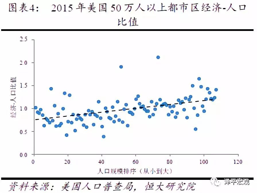 美国人口长期向大都市区集聚,当前50万人以上都市区经济-人口比值的均值为0.98。美国从1910年开始逐渐形成基于都市区(Metropolitan Statistical Areas)的人口统计(最小规模为5万人以上)。1910-2015年,美国都市区人口比重从28.4%增至85.6%;其中,100万人以上都市区人口占全国的比重从1950年的29.4%增至2015年的56.0%,500万人以上都市区的人口比重从12.2%增至25.1%,人口向大都市区集聚的趋势明显。