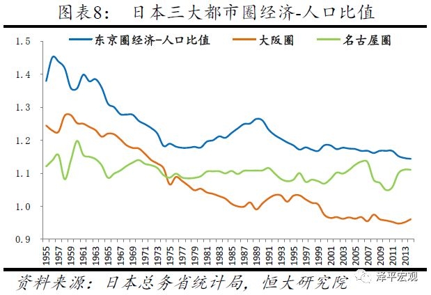 在日本城市化进程中,人口随着产业持续向大都市圈集聚,但在1973年左右从向东京圈、大阪圈、名古屋圈“三极”集聚转为向东京圈“一极”集聚。1)第一阶段,在1970年代日本经济增速换挡以前,因三大都市圈收入水平较高且经济持续集聚,人口大规模流入。1955年东京圈、大阪圈、名古屋圈GDP占全国份额分别为23.8%、15.3%、8.6%,人口占比分别为17.3%、12.3%、7.3%,经济-人口比值为1.38、1.24、1.12。到1970年,三大都市圈GDP占比分别增至29.3%、17.5%、9.5%;1973年人口分别达2607、1636、918万人,占比分别达23.9%、15%、8.4%,经济-人口比值分别为1.22、1.13、1.12(未变)。
