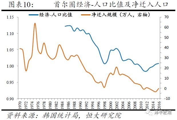 韩国人口长期大规模向首尔圈集聚,直至首尔圈经济-人口比值处于1左右。首尔圈由首尔市、仁川市、京畿道组成,土地面积11830平方公里,占韩国的0.60%。朝鲜战争结束后,首尔圈人口快速增长,从1955年的393万人增至2015年的2442万人(不含外国人),占全国比重从18.3%增至49.1%。在人口持续大量迁入的同时,首尔圈经济-人口比值随经济波动且逐渐下降,1985年为1.122,持续降至2010年0.998,然后在接近1的位置波动,2016年回升至1.008。首尔圈人口(不含外国人)在2010-2015年基本持续净迁出,净迁入人口分别为-0.8、0.7、-0.4、-2.1、-3.3、-0.1万,2016年为1.6万人。