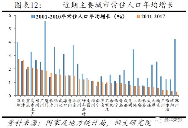 分城市看,人口向大都市区和区域中心城市集聚速度整体放缓,且分化明显,但趋势未改。2011-2017年间,除天津、重庆(主城9区)、南昌、长沙、南宁、石家庄等少数城市外,其他城市常住人口年均增速较2001-2010年均有不同程度下降。