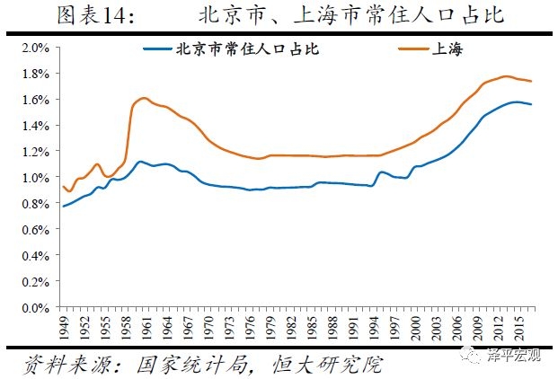 2013年以来,北京市、上海市开始大幅加强人口调控,控制人口总量甚至成为地方政府的第一要务。北京市提出以水定人、以房管人、以证管人、以业控人等。北京市、上海市的人口调控措施主要包括收紧落户审批,清退一般性产业特别是高能耗产业,疏解部分非核心功能,对群租房、地下空间、城乡结合部等联合执法开展综合整治,上调公共服务价格(水、天然气、共同交通)等。受此影响,北京市常住人口增量从2011-2013年的年均51.0万人降至2017年的-2.2万人;上海市常住人口增量从2011-2013年的年均37.5万人降至2017年的-1.4万人。但是,人口集聚可能会在短期由行政力量主导,但在长期仍将决定于市场力量。