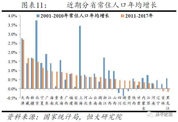 分地区看,与改革开放后人口从中西部地区向东部地区迁徙的传统趋势不同,2010年后中国人口迁徙开始出现新特征:不少人口开始向中西部地区回流,中西部地区净流出人口明显减少,东部地区人口集聚的速度明显放缓。2011-2017年,除福建外,其他东部地区常住人口年均增速较2001-2010年均有不同程度的下滑;而重庆、广西、安徽、湖南、湖北、四川、贵州等中西部地区常住人口年均增速显著提高。东北地区常住人口增速下降严重,黑龙江、辽宁、吉林分别于2014年、2015年、2016年开始负增长。