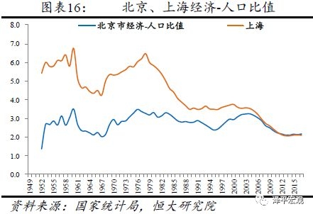 从经济-人口分布的角度看,北京市的经济-人口比值呈波动式变化,但在2004年达3.25的阶段性峰值后基本呈下降趋势,2017年为2.17;上海市呈波动式下降,特别是1978年达6.47的阶段性峰值后呈明显下降趋势,2015年为2.09。即便考虑居住在区外、工作在区内的人口,单纯对北京市、上海市常住人口各加200万,北京市、上海市的经济-人口比值依然高达1.9以上。