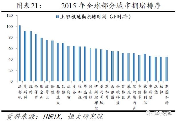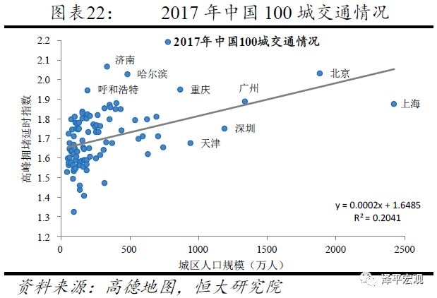 城市交通情况与人口规模确有一定相关性,但可通过城市治理得以改善。根据INRIX发布的2017 Global Traffic Scorecard报告(不含中日韩城市),洛杉矶为全球最堵城市,而非人口规模更大的纽约;莫斯科人口规模虽不及全球前十,但拥堵程度位居第二;哥伦比亚首都波哥大人口不到1000万,但拥堵程度位居全球第六。高德地图发布的《2017年度中国主要城市交通分析报告》显示,100城的高峰拥堵延时指数与城区人口规模的相关系数为0.45,线性回归方程的R方为0.2。具体来看,在拥堵指数上,北京、上海的高峰拥堵延时指数虽然位居前列,但仍有济南、哈尔滨、呼和浩特等城市更为拥堵,深圳市的拥堵排名更是低至37名、武汉、杭州分别位居第47、48名。