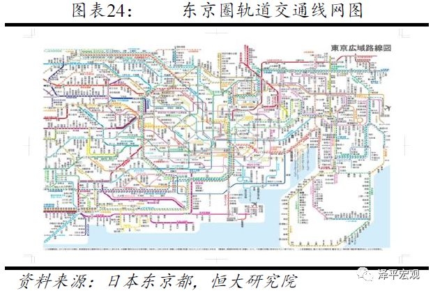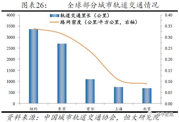 东京圈的经验表明,交通状况与出行结构密切相关。从国际来看,在轨道交通、公共(电)汽车、小汽车、出租车等四种主要出行方式中,东京圈轨道交通出行比例为59.6%,东京都区更是高达78.4%,而在北京这一比例仅为32%。原因在于北京市轨道交通运营里长较短,路网密度偏低。当前,纽约都市区、东京圈、首尔圈轨道交通运营里长高达3347、2705、1098公里,路网密度分别为0.34、0.31、0.23公里/平方公里。而上海、北京都市区的轨道交通运营里长分别为782、685公里,路网密度分别为0.11、0.09公里/平方公里,差距很大。显然,北京、上海轨道交通建设不足是其较为拥堵的一个重要原因。从结构上看,我国城市轨道交通目前主要以地铁为主,其他制式(包括轻轨、单轨、市域快轨、现代有轨电车、磁浮交通、APM 共 6 种)等发展非常不足。《北京城市总体规划(2016-2035)》提出,到2020年、2035年,北京市轨道交通运营里长将分别增至1000、2500公里;《上海城市总体规划(2017-2035)》要求到2035年增至3000公里以上。