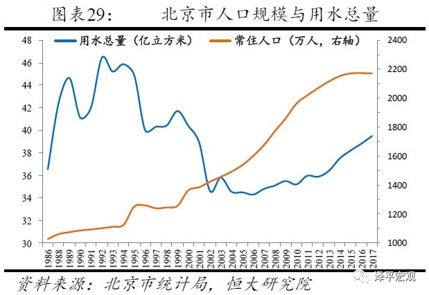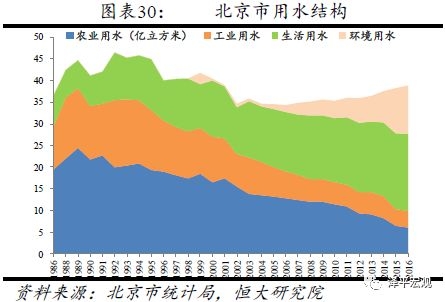 从需求侧看,1)生活用水(含公共用水)。2016年北京市人均生活用水量约为225升/日,高于全国城镇220升/日的平均水平,还有较大下调空间。以人均生活用水量180升/日计,常住人口达3000万需生活用水19.7亿立方米/年。2)环境用水(指美化城市环境、协调自然生态平衡)。2005-2016年北京市环境用水量从1.1亿立方米增至11.1亿立方米,人均环境用水量从20升/日提高至154升/日。以未来人均环境用水量180升/日计,3000万人需要环境用水19.7亿立方米/年。3)工农业用水。2016年工业用水、农业用水分别为3.8、6亿立方米,两项合计为9.8亿立方米,较2000年的27亿立方米、2010年的16.5亿立方米大幅下降。考虑未来北京市继续疏解一般工业、耕地跨省占补平衡及发展高效节水农业等因素,工农业用水至少还有3亿立方米的下调空间。上述加总,未来北京市用水需求总量为46.2亿立方米/年。