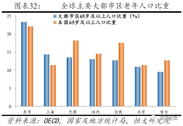 北京上海人口发展存在的突出问题。1)老龄化严重。当前北京、上海户籍65岁及以上比重分别达16.5%、21.8%,远高于全国的11.4%。大量年轻外来人口涌入使得两地常住人口老龄化程度大幅下降至10.9%、14.3%。从全球角度看,国际大都市区的老年人口比重多明显低于本国平均水平。2)人口分布失衡。接近一半的人口聚集在北京市五环内、上海市外环内区域,人口密度分别高达1.6万、1.7万人/平方公里,明显高于东京都区、首尔市的1.5万、1.6万人/平方公里,北京、上海的核心区域人口已严重饱和。3)职住分离严重。就业过度集中在中心城,一些新城“睡城效应”明显,比如北京的回龙观-天通苑地区。