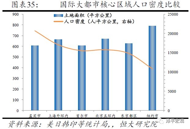 从国际视角看,北京市和上海市的核心区域人口已经严重饱和,需要严格控制。北京五环内、上海外环内土地面积分别为668、664平方公里,与孟买市、首尔市、东京都区的土地面积非常接近。当前,北京五环内、上海外环内人口密度分别为15774人/平方公里、17056人/平方公里,而孟买市为20692/平方公里、首尔市为15527人/平方公里(高峰曾达17500人/平方公里)、东京都区为14797人/平方公里。孟买市人口密明显高于其他城市,可能在于贫民窟的大规模存在,不能作为参照。东京都区、首尔市分别作为发达经济体日韩第一大都市区的核心区域,其人口密度可以作为北京五环内、上海外环内的参照,这意味着北京五环内、上海外环内人口密度已经偏高,需要严格控制。