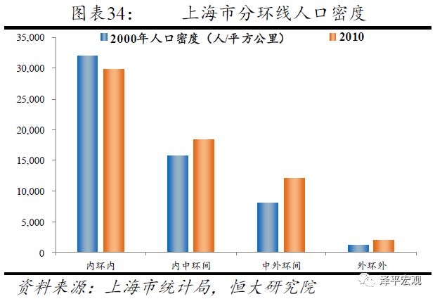 北京市、上海市的人口分布的区域差异很大,北京市五环内、上海市外环内均集聚了接近一半的常住人口。分环线看,北京市的二环-三环人口密度最高,接近27000人/平方公里;其次是二环内、三环-四环、四环-五环。在五环-六环间,人口密度则不到3600人/平方公里;在六环外,人口密度更是低至不到400人/平方公里。上海市人口分布同样呈现典型的中心-外围递减趋势,内环内人口密度接近30000人/平方公里,其次是内中环间、中外环间、外环外。上海市外环外人口仅有约2000人/平方公里,仅相当于内环内人口密度的7%。
