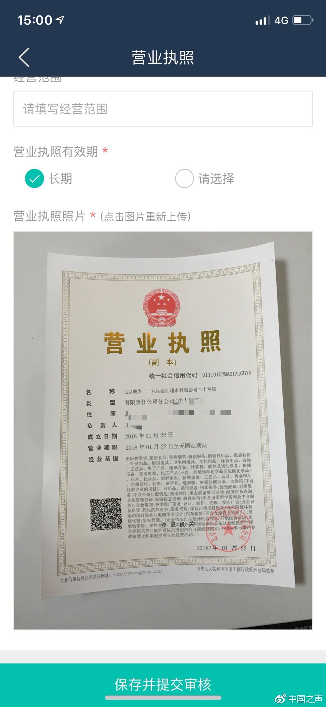 通过美团外卖商家APP记者发现,虽然上传了手持身份证照片,但店铺业主并不是记者自己,而是一个名为王某的人,此外要求必须上传的实体店照片,完全是PS而成,美团要求实地拍摄的营业执照和食品经营许可证,也都是通过PS完成,执照上有明显的后期制作痕迹。