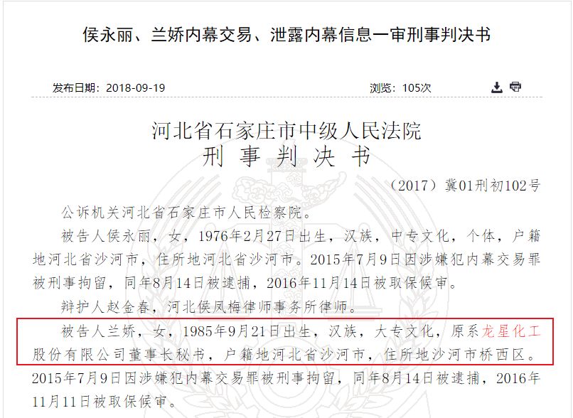 出生于1985年的龙星化工董事长秘书兰娇,在密拍收购文件、偷听收购信息后,买了自家公司近200万元股票,获利10万余元。值得一提的是,内幕交易的钱大部分还是找董事长借来的。