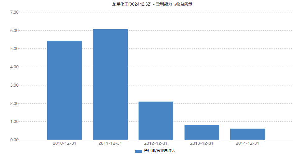 每经小编(微信号:nbdnews)注意到,年报显示,龙星化工在2012年到2014年,净利润/营业总收入的比值较此前两年出现断崖式下滑,反映其盈利能力已经大不如前。