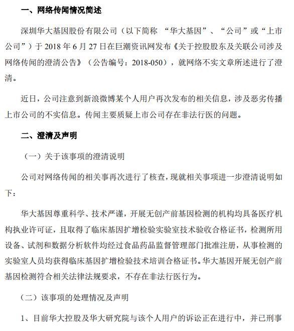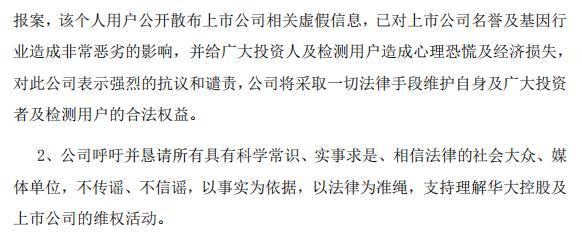 传闻主要质疑上市公司存在非法行医的问题。公告称,华大基因开展无创产前基因检测符合相关法律法规要求,不存在非法行医行为。目前华大控股及华大研究院与该个人用户的诉讼正在进行中,并已刑事报案,该个人用户公开散布上市公司相关虚假信息,已对上市公司名誉及基因行业造成非常恶劣的影响,并给广大投资人及检测用户造成心理恐慌及经济损失,对此公司表示强烈的抗议和谴责,公司将采取一切法律手段维护自身及广大投资者及检测用户的合法权益。