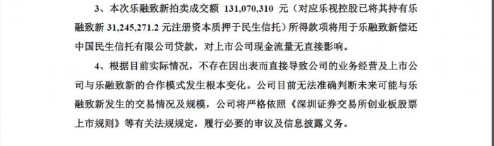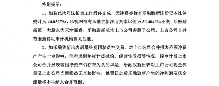 人民法院诉讼资产网显示,乐视控股持有的乐融致新18.38%股权分为两部分被司法拍卖。其中,第一部分是乐视控股持有的2618.3万元出资额,约为乐融致新增资前8.38%的股权,起拍价1.09亿元,申请执行人为中航信托;第二部分是乐视控股持有乐融致新的3124.5万出资额,相当于乐增资前的10%股权,起拍价1.31亿元,申请执行人为民生信托。
