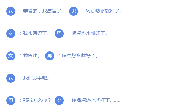 俗话说,段子来源于生活,相信每个女性同胞都经历过类似的对话。在某网站的#女孩最讨厌的10句话#调查结果中,“多喝热水”一词挤掉另外讨人嫌的9句:“你又怎么了、呵呵、以后再说、都是我的错、随便、还在吗、吃了没、你忙、早点睡”,突破重围,位列榜首。