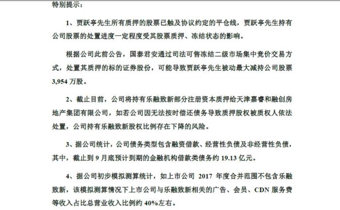 “据公司初步模拟测算统计,如上市公司2017年度合并范围不包含乐融致新,该模拟测算情况下上市公司与乐融致新相关的广告、会员、CDN服务费等收入占比总营业收入比例约40%左右。”乐视网称。