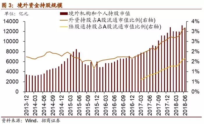 外资大规模涌入,使其成为A股市场的重要投资者,持股在A股市场的占比连续提升。截至2018年6月末,境外机构和个人持股规模达1.28万亿元,占同期A股流通股市值的比例为3.18%;其中,通过陆股通持股6606.07亿元,约占外资持股总规模的51.8%,已超半数,较去年同期的39.9%大幅提升,进一步说明陆股通已经成为境外资金投资A股市场的重要途径。