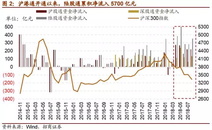 2017年以来外资加速流入A股,即使在今年市场不断下调的情况下,外资的投资热情依然不减。沪深港通开通以后,通过陆股通流入A股的境外资金累计达到约5700亿元,其中2018年净流入2226亿元。