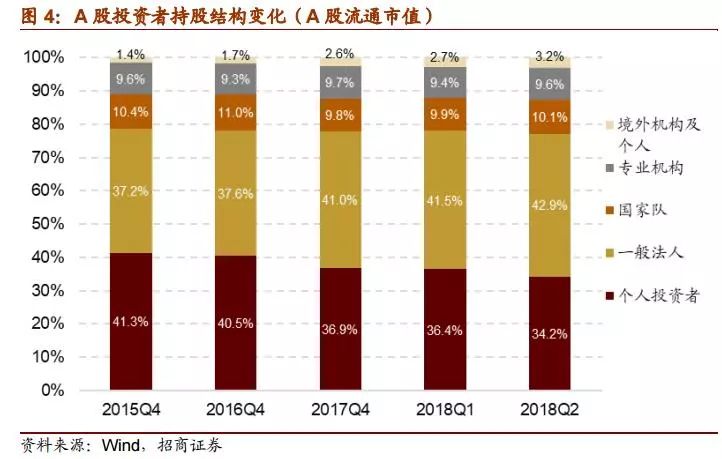 在当前A股市场投资者仍以散户和一般法人为主的格局下,外资的参与增强了长期价值投资者的力量。2015~2017年,A股散户的持股比例总体呈现下降趋势,境内专业机构投资者持股比例小幅增加,而外资的持股比例上升明显,对A股市场的专业机构投资者队伍形成了有力补充。