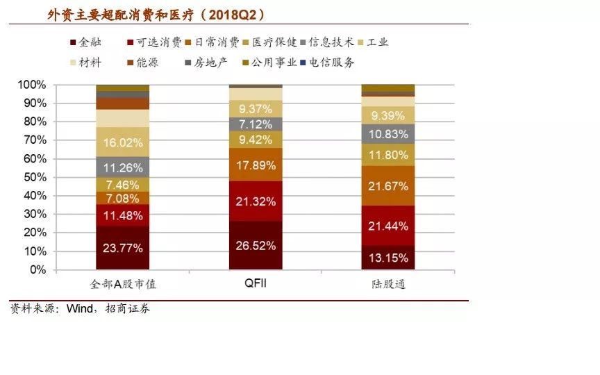 以全部A股市值分布为基准,外资总体明显超配消费(日常消费和可选消费)和医疗,低配中上游行业,且陆股通低配金融,QFII低配信息技术。具体来看,2018年二季度末,QFII和陆股通持股中消费(日常&可选)分别占比39.2%和43.1%,较A股总体高出不止20个百分点。陆股通持股中金融占比(13.15%)明显低于A股总体(23.8%),而QFII持股中金融行业占比(26.5%)与A股总体较为接近。