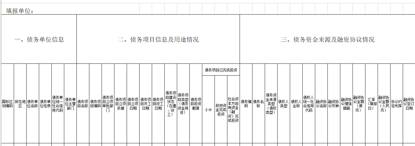三是,债务资金来源及融资协议情况:包括债务编码、债务名称、债务资金来源类型(债权类型)、债权人类型、债权人全称、债权人统一社会信用代码、融资协议名称、融资协议币种、融资协议增信措施、融资协议金额(原币)、汇率(填报日)、融资协议金额(人民币)、协议约定利率、融资协议签订日期。