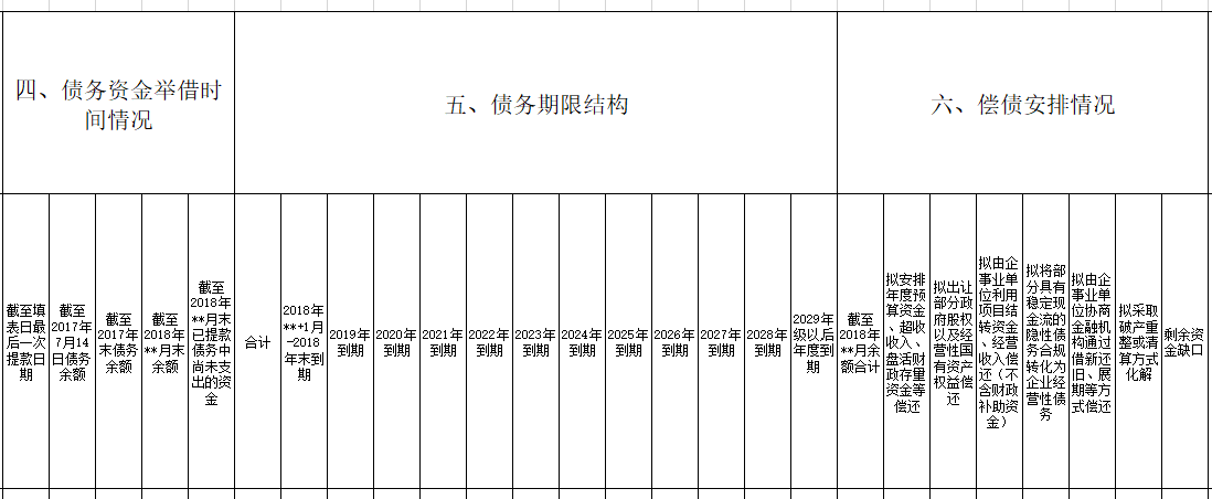 六是,偿债安排情况:包括截至2018年**月余额合计;拟安排年度预算资金、超收收入、盘活财政存量资金等偿还;拟出让部分政府股权以及经营性国有资产权益偿还;拟由企事业单位利用项目结转资金、经营收入偿还(不含财政补助资金);拟将部分具有稳定现金流的隐性债务合规转化为企业经营性债务;拟由企事业单位协商金融机构通过借新还旧、展期等方式偿还;拟采取破产重整或清算方式化解;剩余资金缺口。