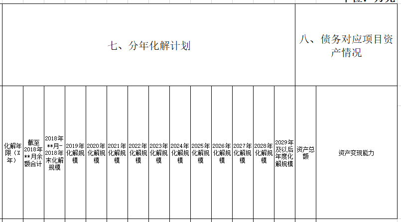 七是分年化解计划,包括化解年限(X年)、截至2018年**月余额合计、2018年**月-2018年末化解规模,以及2019年-2028年每年化解规模,2029年及以后年度化解规模等。