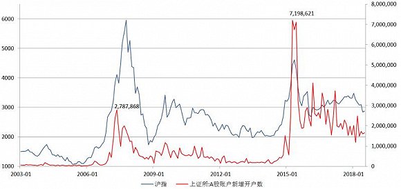 A股账户新增开户数向来被认为是反映市场情绪的一大指标。界面新闻对比了2003年以来上证所A股账户新增开户数与同期沪指走势的变化情况: