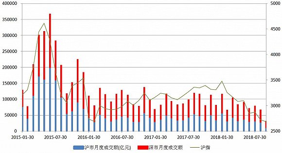 今年以来两市成交总额总体下行趋势明显,其中2月份为6.41万亿元,仅为 2015年6月峰值时的18%,9月份以来的数值更是缩减到2.95万亿元。
