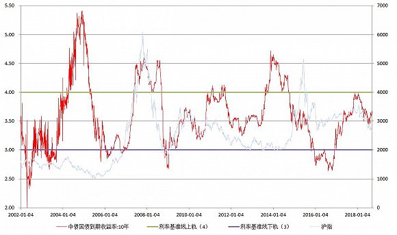 界面新闻选取了10年期中债国债到期收益率为指标,对比了其自2002年以来与同期沪指的变化情况。