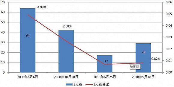 低价股数量和占比方面也反映出类似的情形,由下图可以看出,9月18日A股共有29只个股最新收盘价在2元以下,占上市个股总数的0.85%,这一数字已经远远低于上一轮大熊市最底部时所创下的数值。