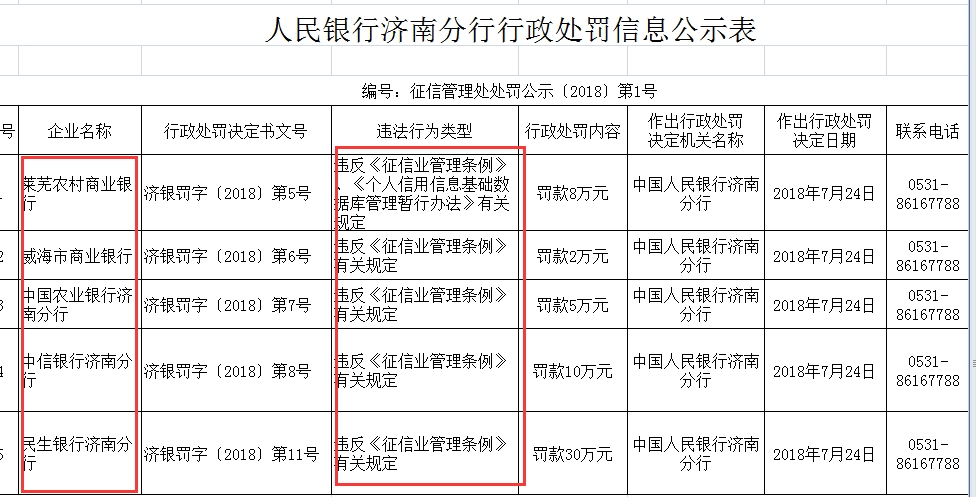 莱芜农村商业银行因违反《征信业管理条例》、《个人信用信息基础数据库管理暂行办法》有关规定,被罚款8万元;威海市商业银行、中国农业银行济南分行、中信银行济南分行、民生银行济南分行都因违反《征信业管理条例》有关规定分别予以罚款2万元、5万元、10万元、30万元。