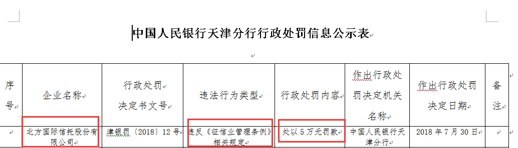 近日,北方国际信托收到一张5万元的罚单,系首家因征信违规被罚的信托公司。