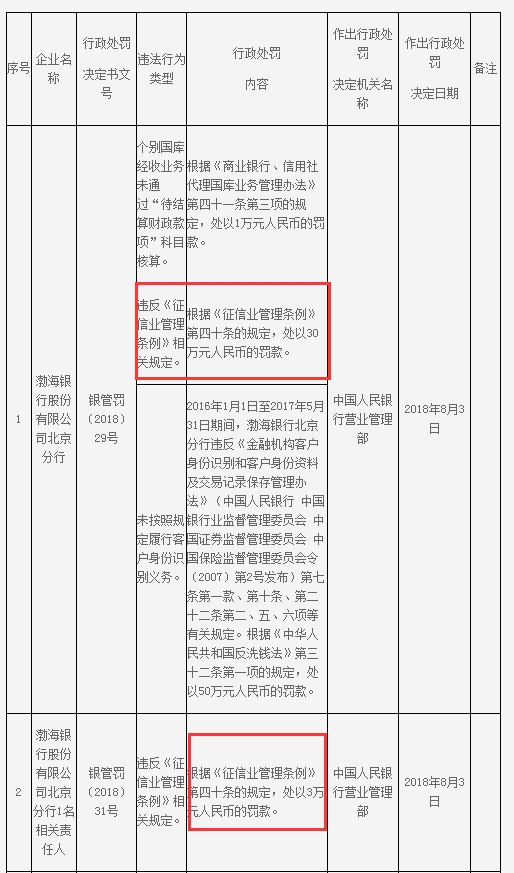 其中,渤海银行因个别国库经收业务未通过“待结算财政款项”科目核算、未按照规定履行客户身份识别义务,违反了《征信业管理条例》相关规定,被央行营管部对其处以合计94万元罚款。