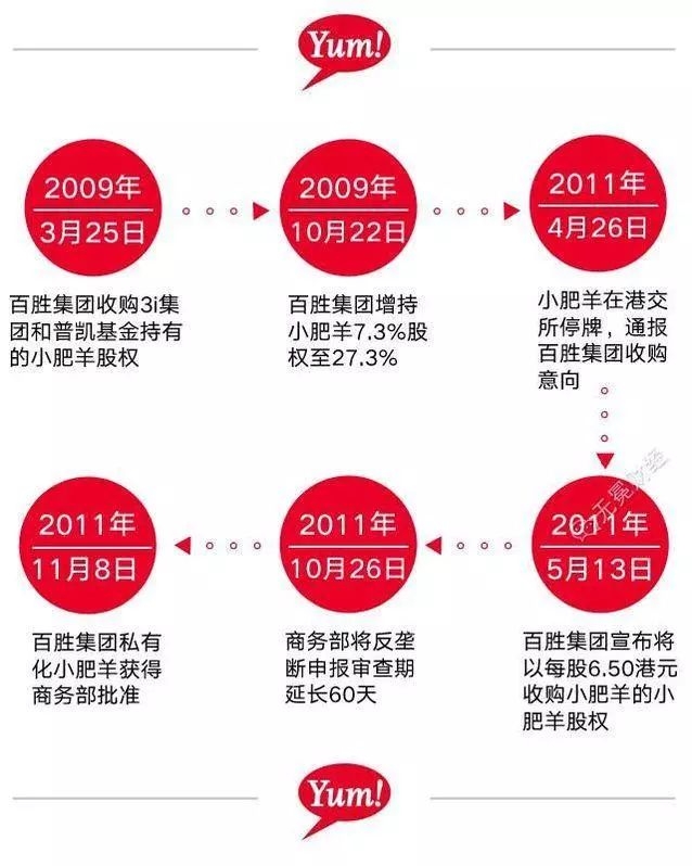 2009年3月,百胜通过旗下投资公司购买了小肥羊20%股份。对此,当时有人用“以后可以在肯德基里吃火锅了”来进行调侃。2012年2月,百胜以近46亿港元现金完成对小肥羊的私有化,使其总持股量达93.2%,剩余6.8%股权则由小肥羊创始人张钢和陈洪凯持有。