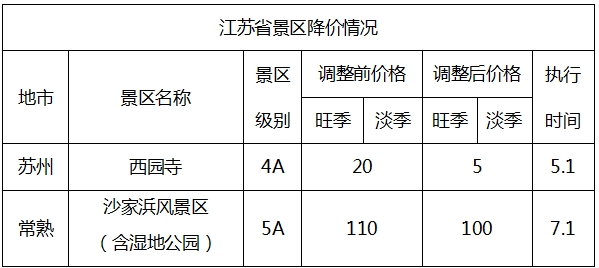 瘦西湖风景区实施票价从旺季150元降低到100元,新标准从3月29日开始实施。另外,苏州沐春园景区取消门票价格55元,免费对游客开放;皂河古镇联票从70元降到60元;龙王庙行宫从60元降到50元。