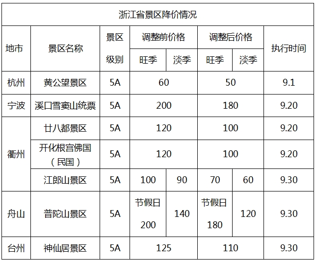 9月20日起执行,旺季门票价格由220元/人降为190元/人,淡季门票价格维持80元/人。
