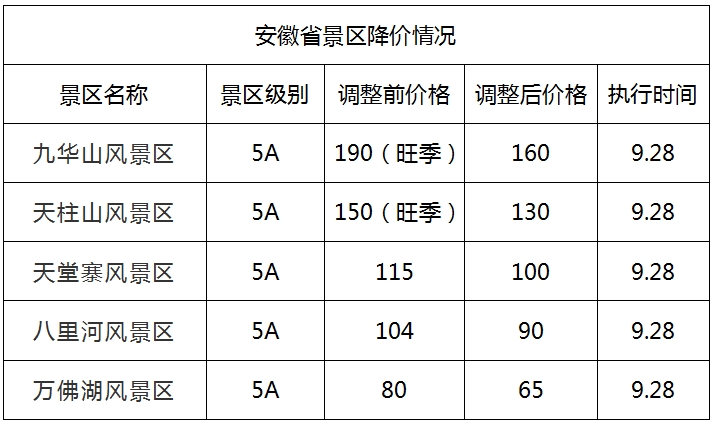 自9月28日起,黄山风景区旺季门票价格由230元/人降为190元/人。