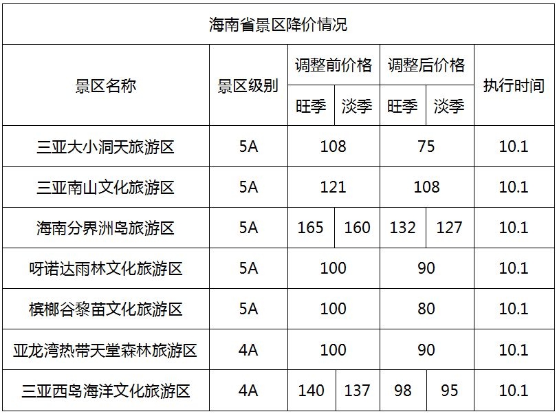 10月1日起,三亚蜈支洲岛旅游区门票价格旺季最高限价由160元/人次下调至144元/人·次,淡季最高限价由152元/人·次下调至136元/人·次。