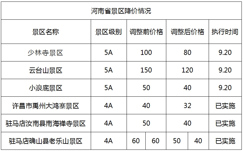 此外,河南省除省管4家景区外,另有3家市县管理景区出台降价方案,国庆节前还将有13家景区拟实施降价措施。