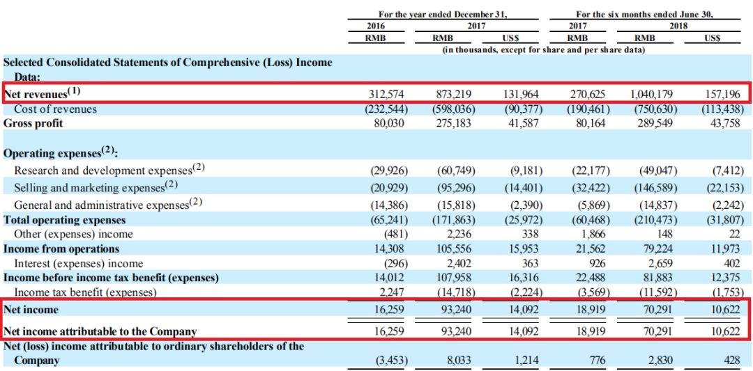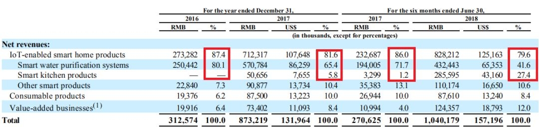 招股书显示,云米科技2017年净营收8.73亿元(约1.32亿美元),与2016年的3.13亿元相比增长179%;2018年上半年净营收10.4亿元(约1.57亿美元),比去年同期的2.71亿元大增284%。