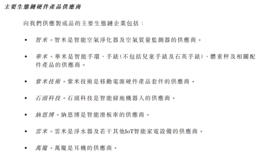 虽然小米投资、孵化的企业很多,但在小米招股书中,位列其主要生态链硬件产品供应商名录的不多,只有7家。除了云米,还包括已在美上市的智能手环供应商华米、空气净化器供应商智米、移动电源硬件供应商紫米等。
