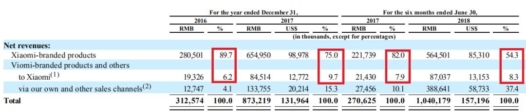 据披露,2016-2017年,云米科技通过小米获得的收入(小米贴牌产品、卖给小米的自有品牌产品)占其净收入的95.9%、84.7%,而2017年和2018年的上半年,这一占比分别为89.9%、62.6%。