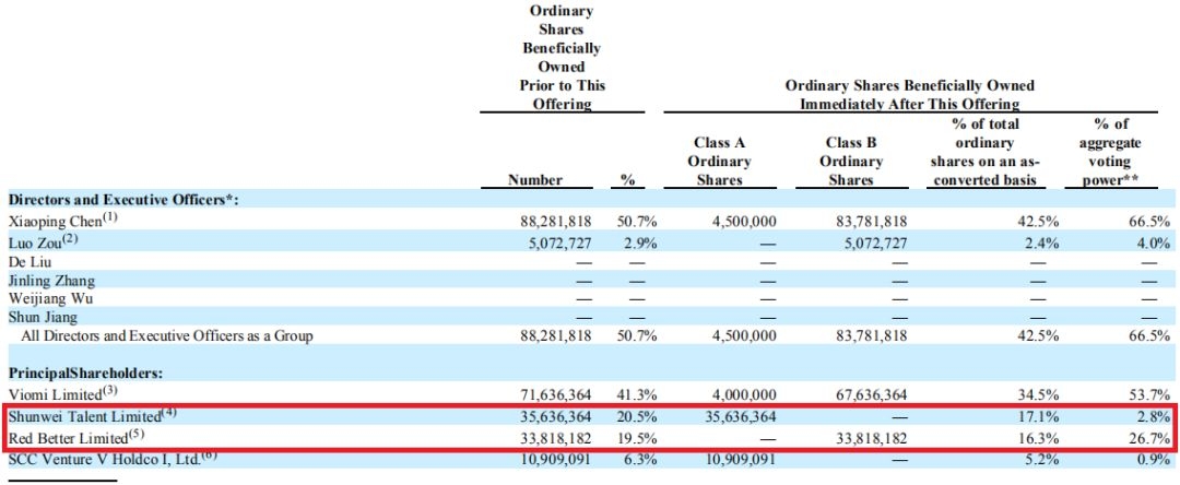 此外,云米科技创始人兼CEO陈小平持股42.5%,红杉资本旗下基金SCC Venture V Holdco I, Ltd.持股5.2%。